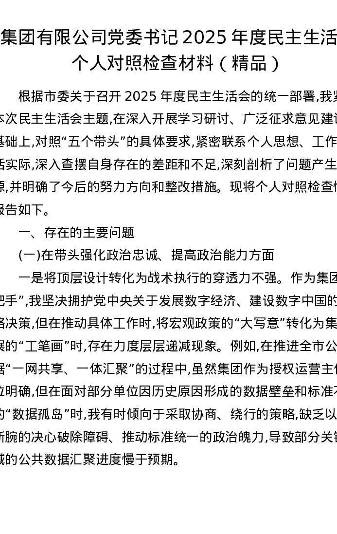 集团有限公司党委书记2025年度xxxxx个人对照检查材料