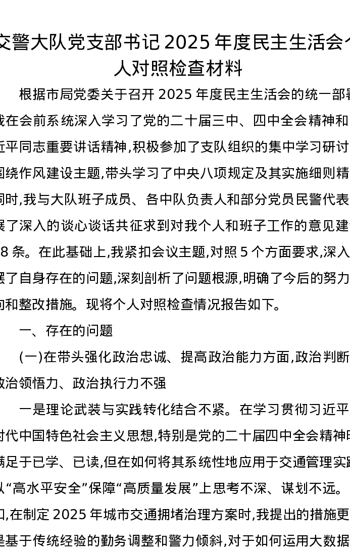 交警大队党支部书记2025年度xxxxx个人对照检查材料