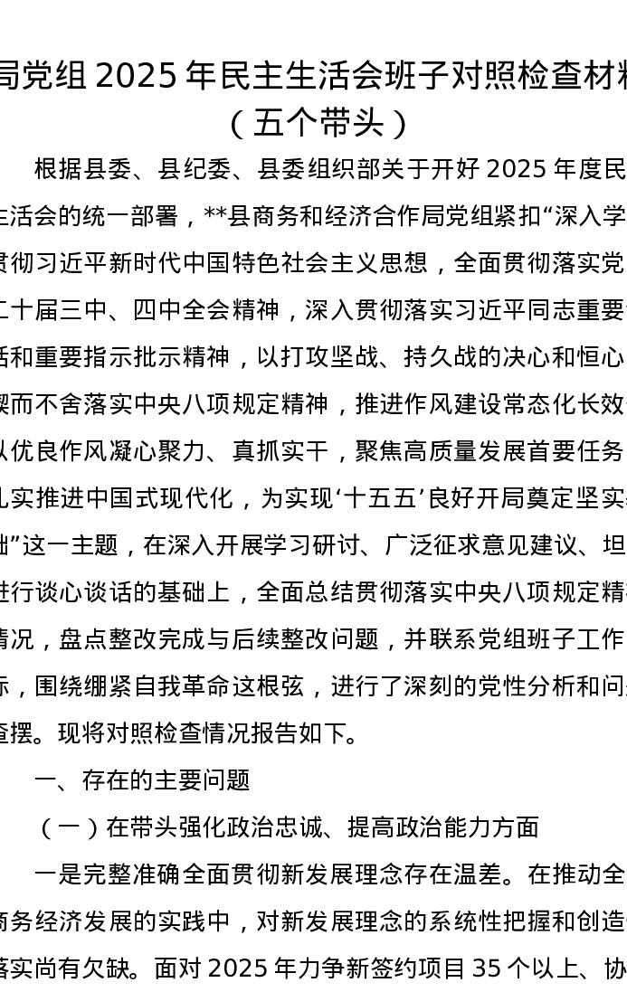 局党组2025年xxxxx班子对照检查材料(五个带头)