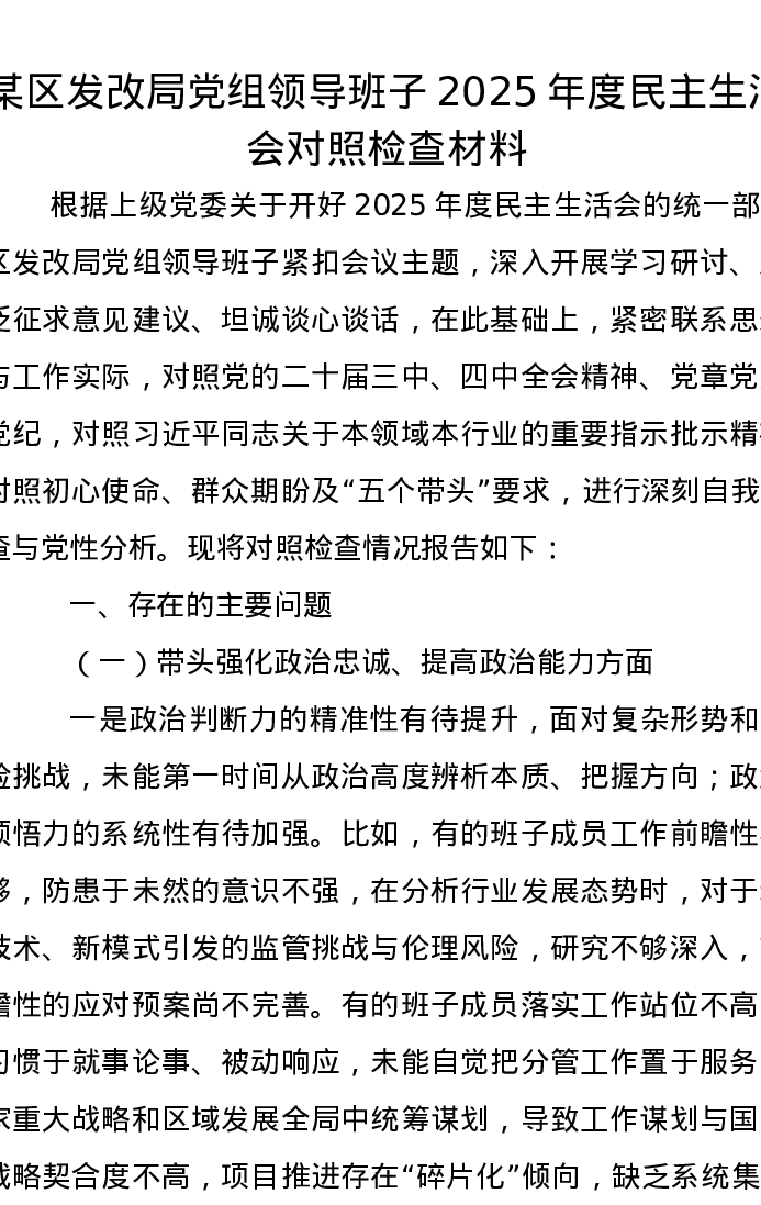 某区发改局党组领导班子2025年度xxxxx对照检查材料