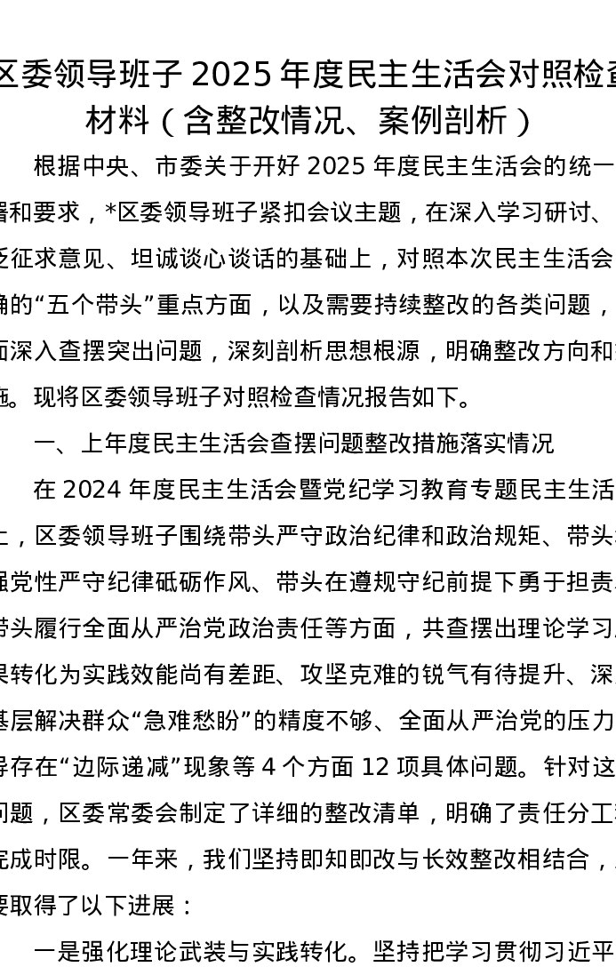 区委领导班子2025年度xxxxx对照检查材料(含整改情况、案例剖析)