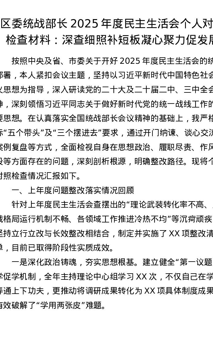 区委统战部长2025年度xxxxx个人对照检查材料:深查细照补短板 凝心聚力促发展