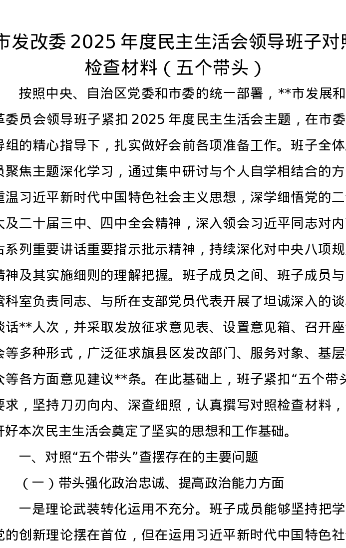 市发改委2025年度xxxxx领导班子对照检查材料(五个带头)