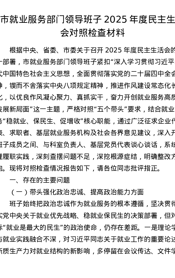 市就业服务部门领导班子2025年度xxxxx对照检查材料