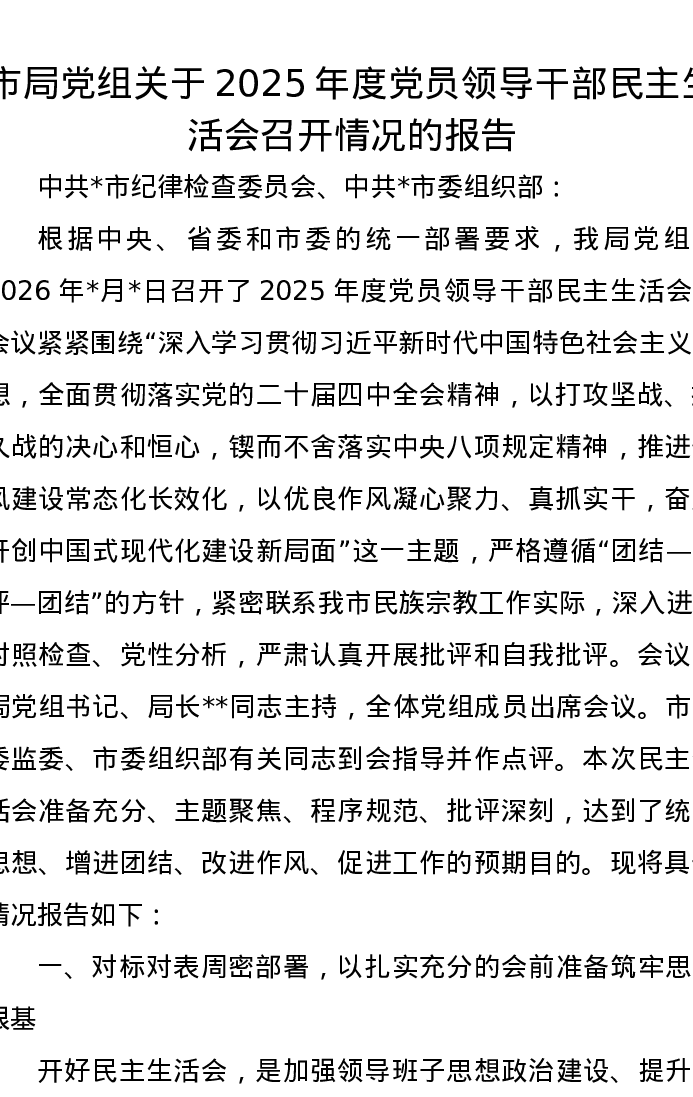 市局党组关于2025年度党员领导干部xxxxx召开情况的报告