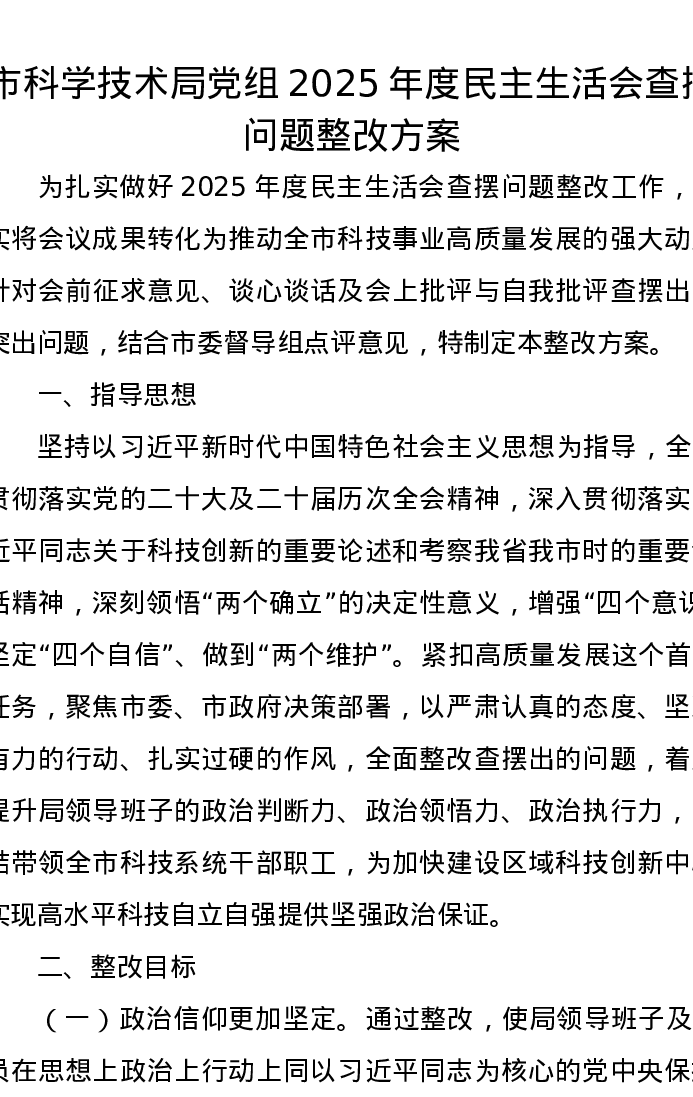 市科学技术局党组2025年度xxxxx查摆问题整改方案
