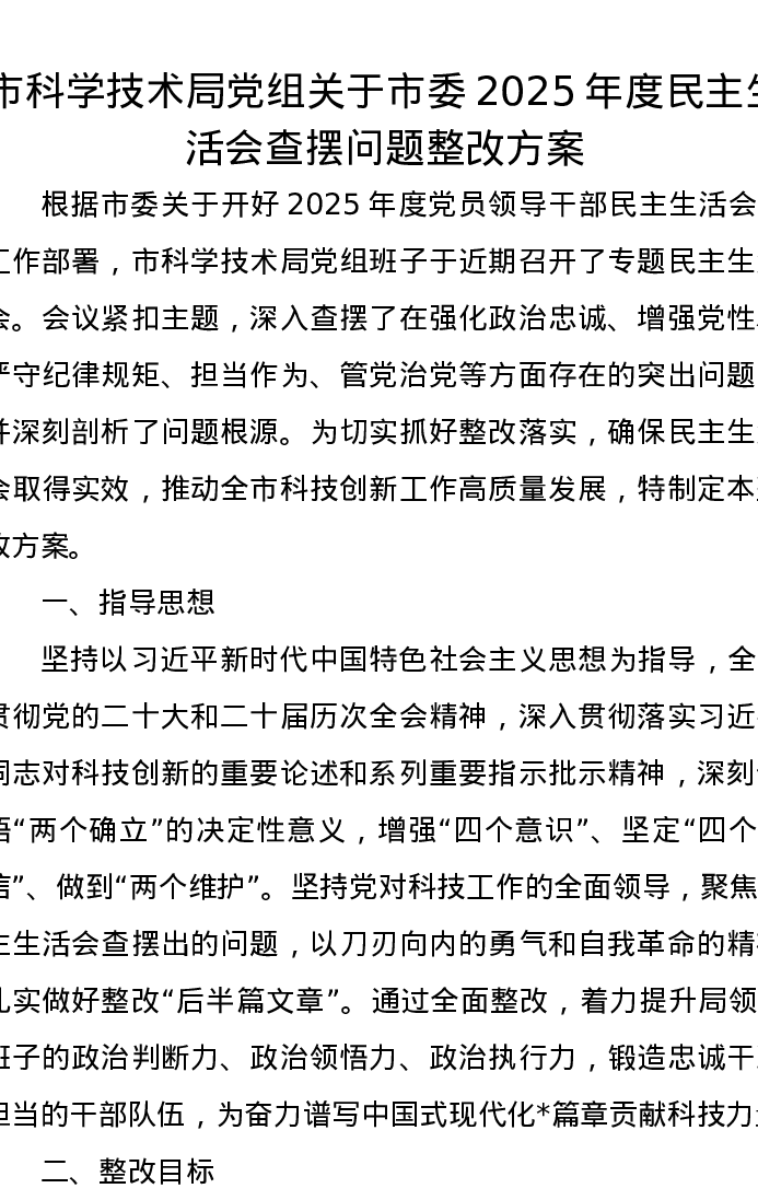 市科学技术局党组关于市委2025年度xxxxx查摆问题整改方案