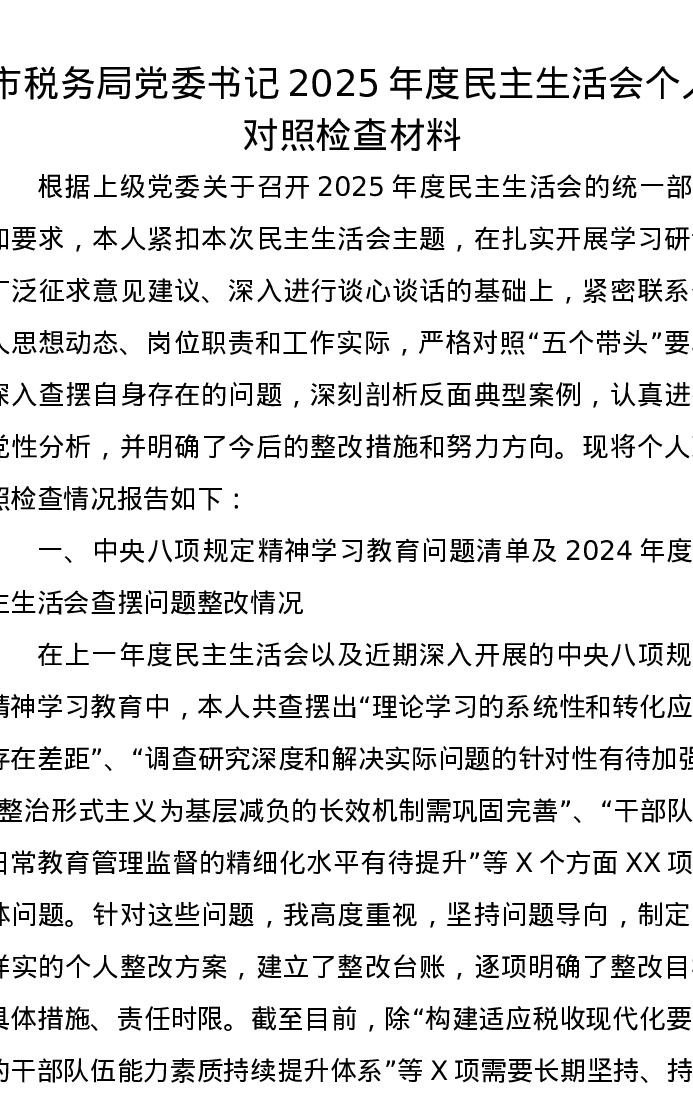 市税务局党委书记2025年度xxxxx个人对照检查材料