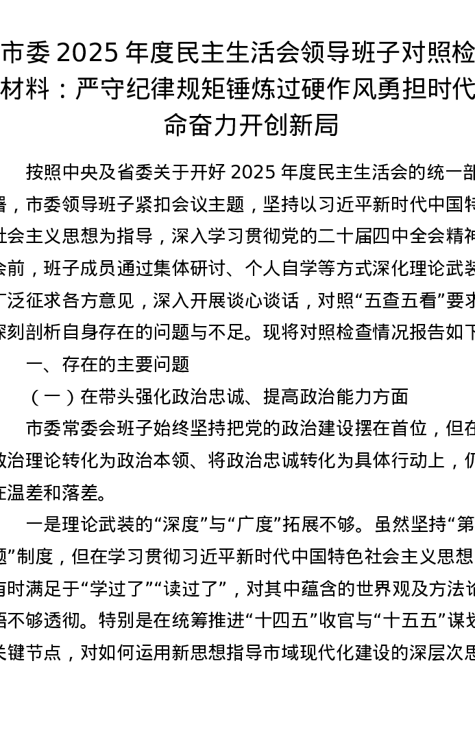 市委2025年度xxxxx领导班子对照检查材料:严守纪律规矩锤炼过硬作风 勇担时代使命奋力开创新局