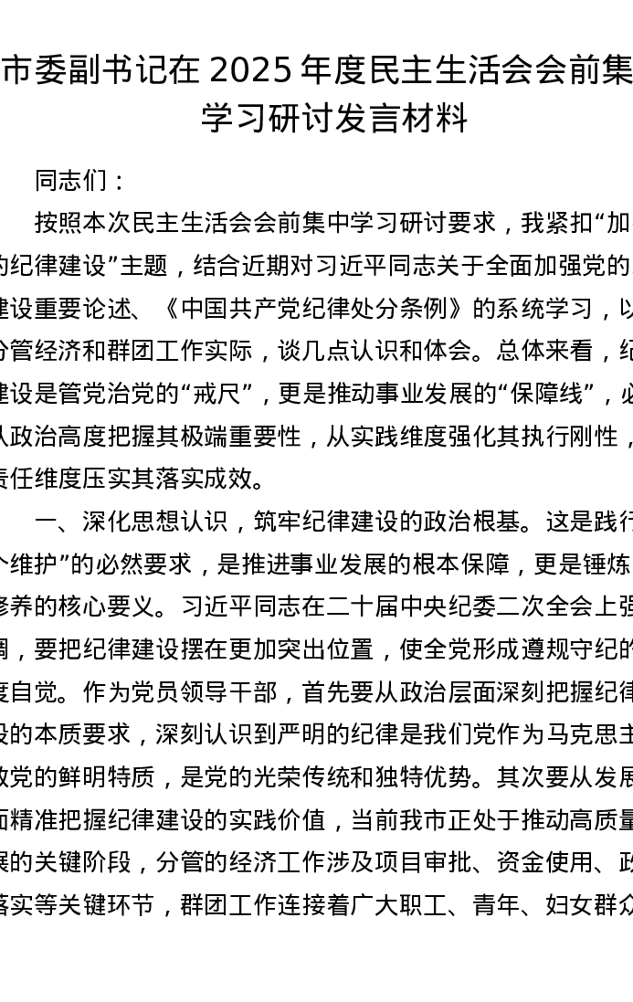 市委副书记在2025年度xxxxx会前集中学习研讨发言材料