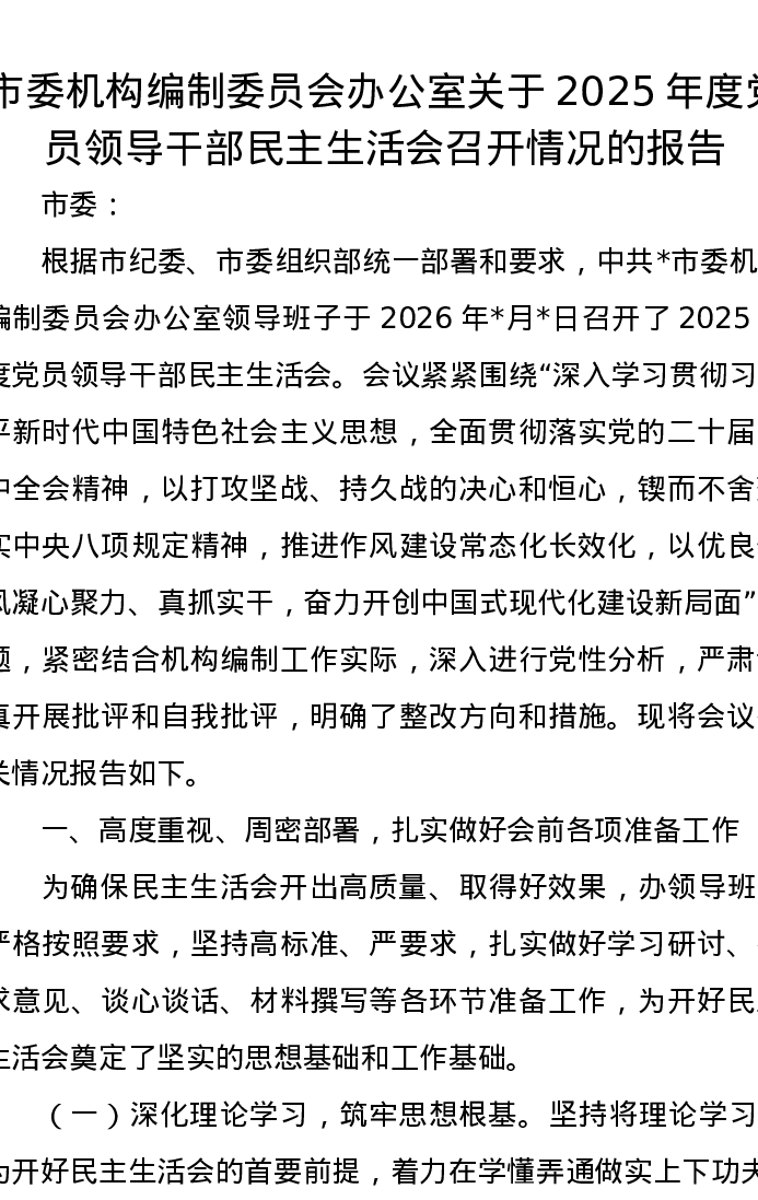 市委机构编制委员会办公室关于2025年度党员领导干部xxxxx召开情况的报告
