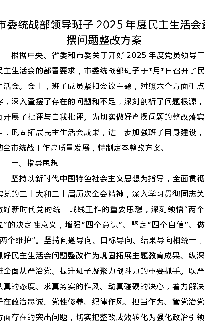 市委统战部领导班子2025年度xxxxx查摆问题整改方案