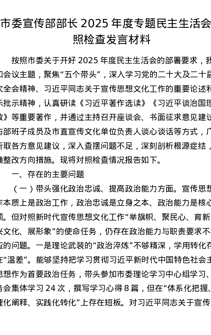 市委宣传部部长2025年度专题xxxxx对照检查发言材料