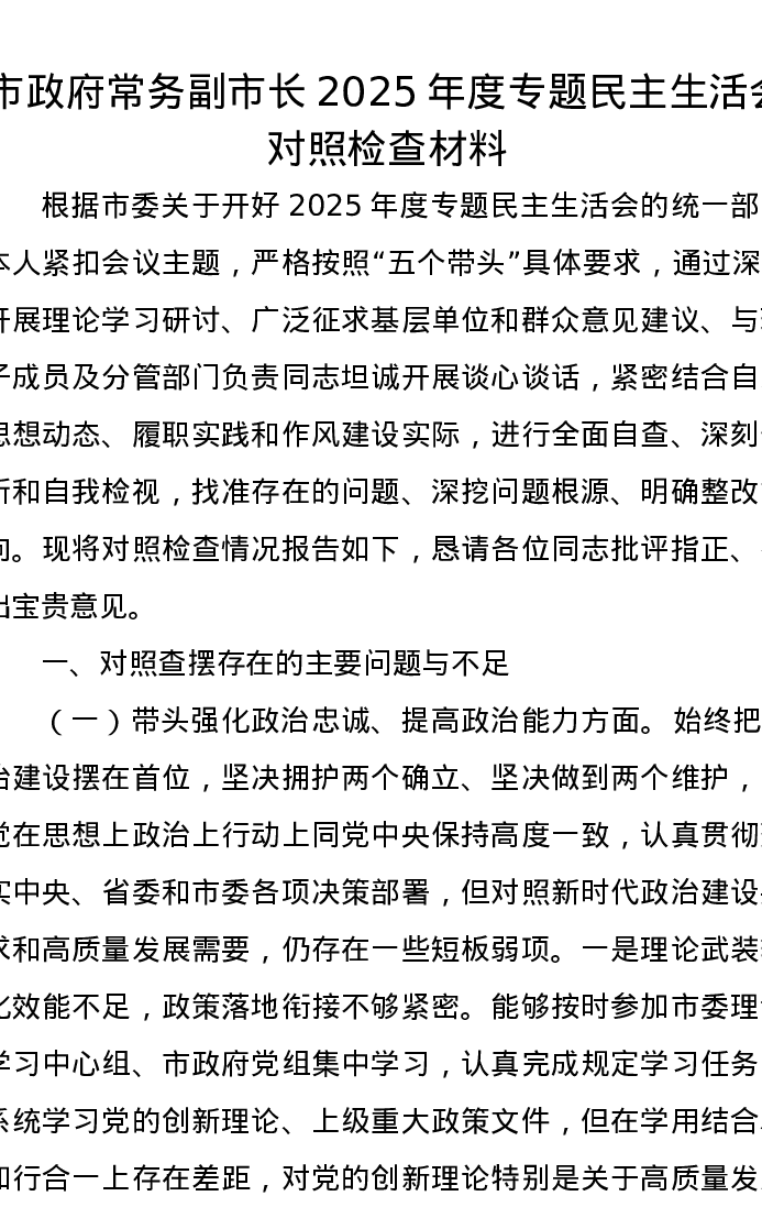 市政府常务副市长2025年度专题xxxxx对照检查材料