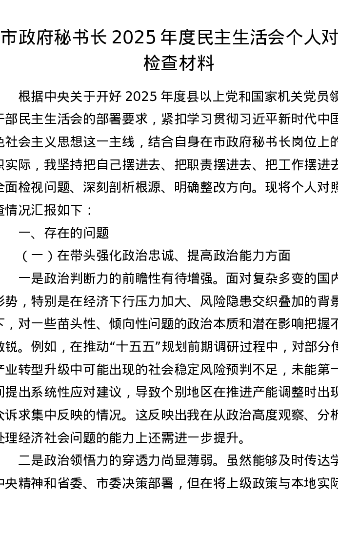 市政府秘书长2025年度xxxxx个人对照检查材料