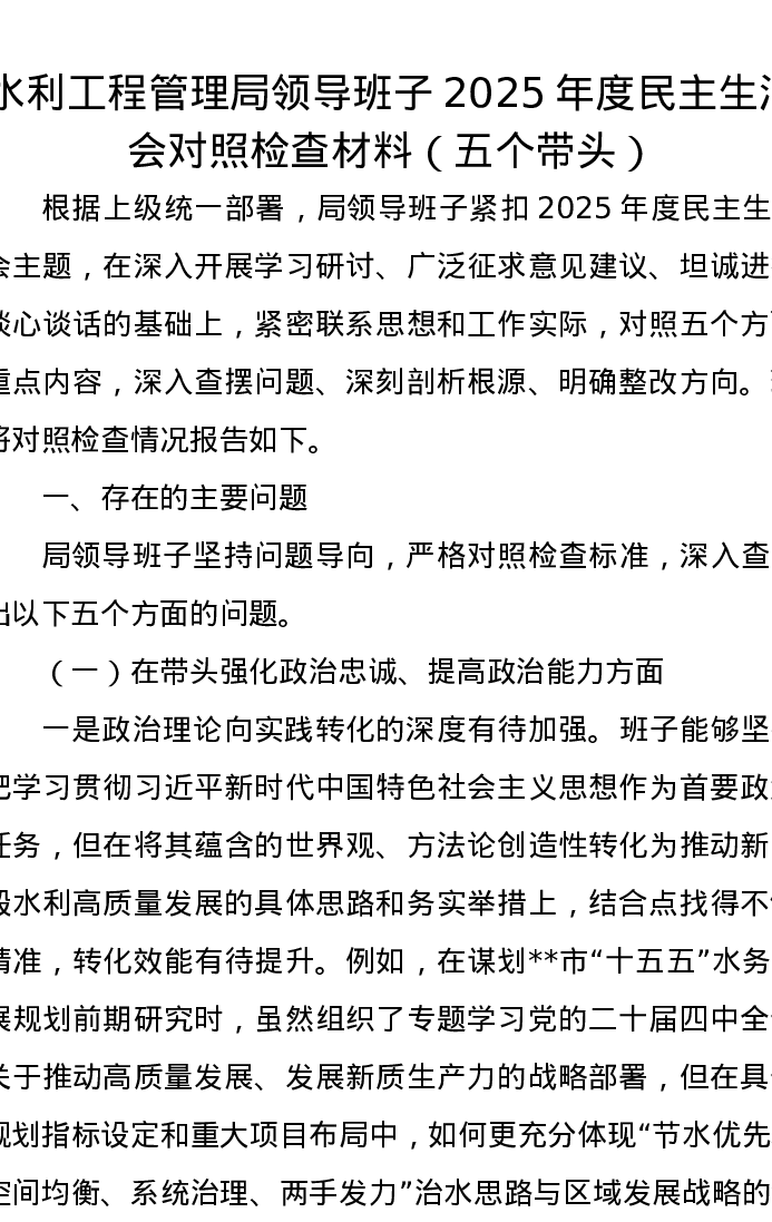 水利工程管理局领导班子2025年度xxxxx对照检查材料(五个带头)