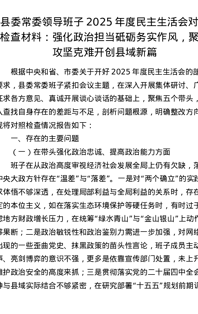 县委常委领导班子2025年度xxxxx对照检查材料:强化政治担当砥砺务实作风,聚力攻坚克难开创县域新篇