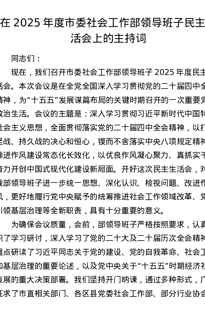在2025年度市委社会工作部领导班子xxxxx上的主持词