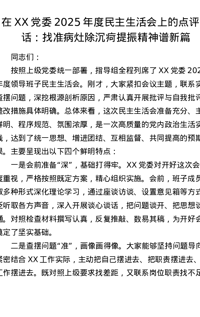 在XX党委2025年度xxxxx上的点评讲话:找准病灶除沉疴 提振精神谱新篇