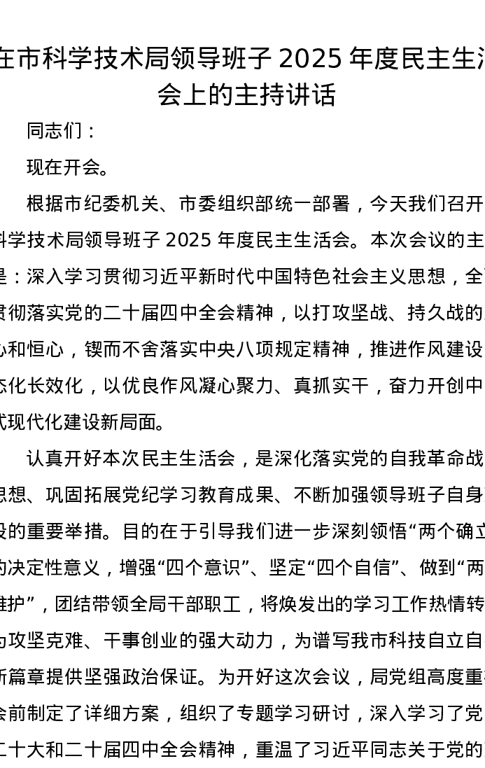 在市科学技术局领导班子2025年度xxxxx上的主持讲话