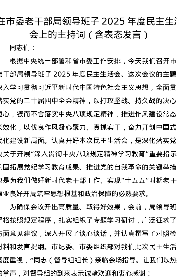 在市委老干部局领导班子2025年度xxxxx上的主持词(含表态发言)