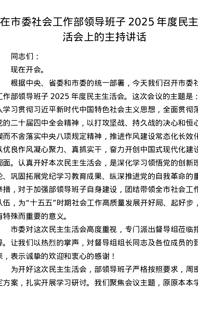 在市委社会工作部领导班子2025年度xxxxx上的主持讲话
