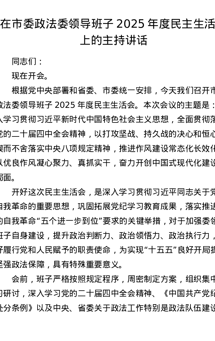 在市委政法委领导班子2025年度xxxxx上的主持讲话