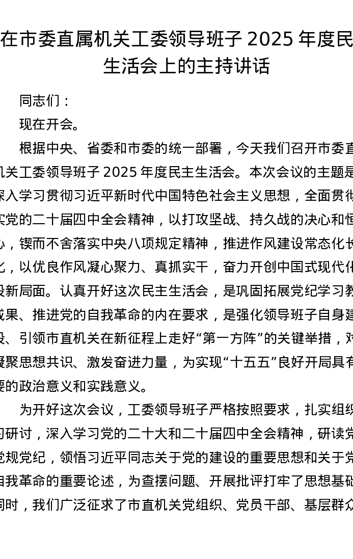 在市委直属机关工委领导班子2025年度xxxxx上的主持讲话
