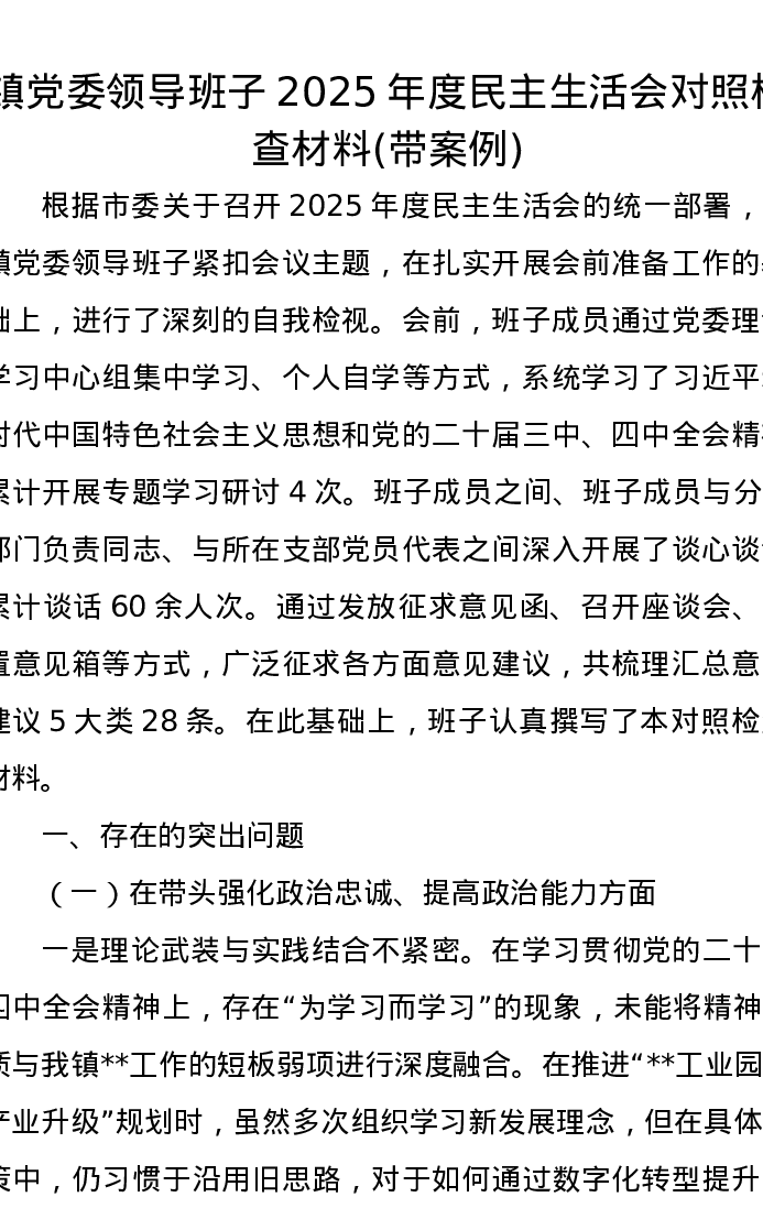 镇党委领导班子2025年度xxxxx对照检查材料(带案例)