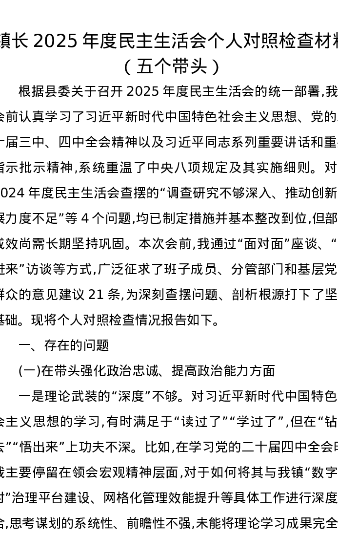镇长2025年度xxxxx个人对照检查材料(五个带头)