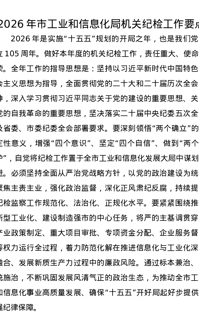 2026年市工业和信息化局机关纪检工作要点
