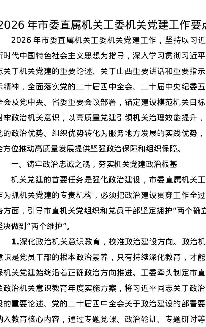 2026年市委直属机关工委机关党建工作要点