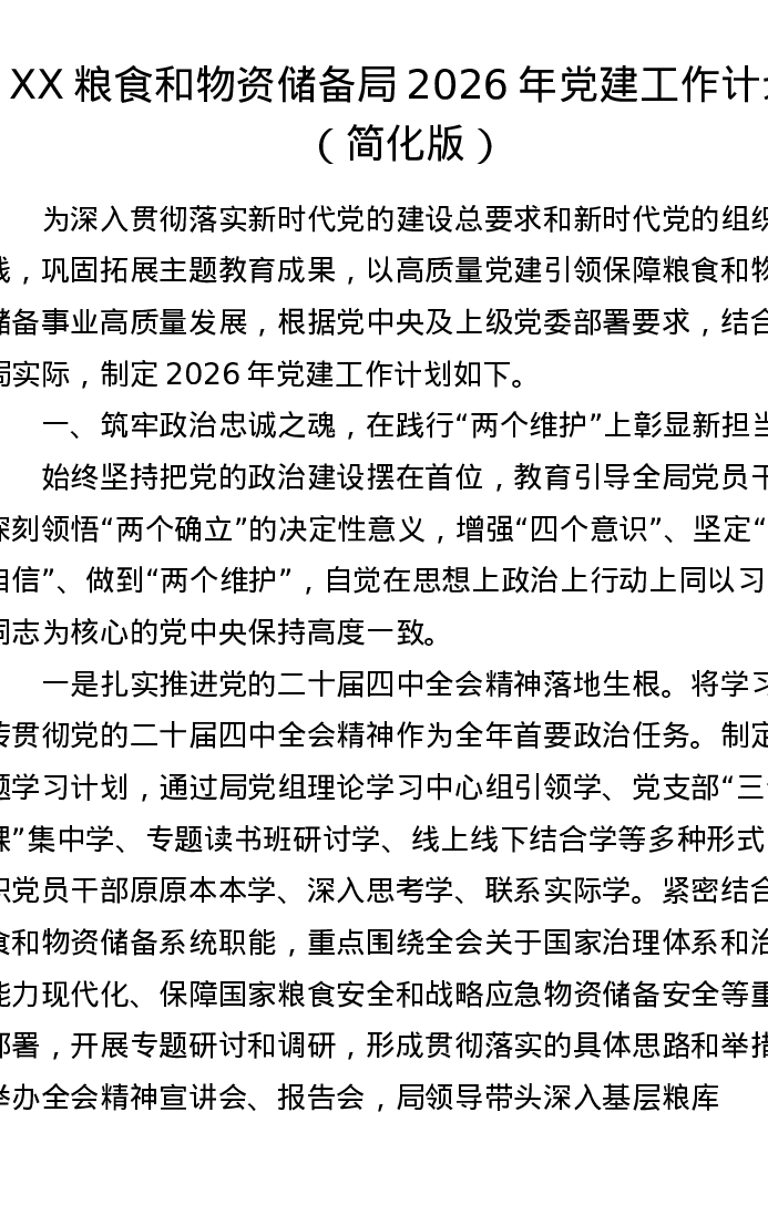 XX粮食和物资储备局2026年党建工作计划(简化版)