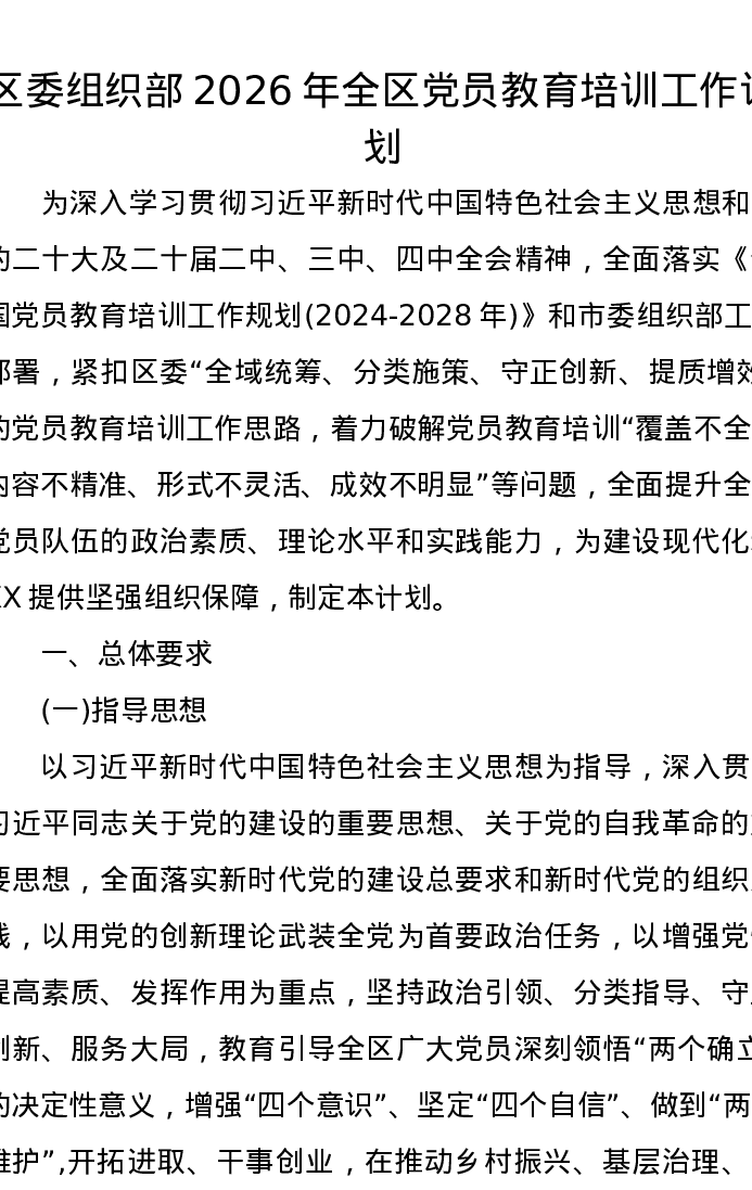 区委组织部2026年全区党员教育培训工作计划