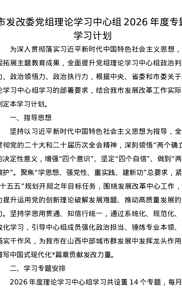 市发改委党组理论学习中心组2026年度专题学习计划