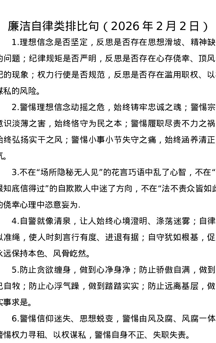 廉洁自律类 排比句(2026年2月2日)