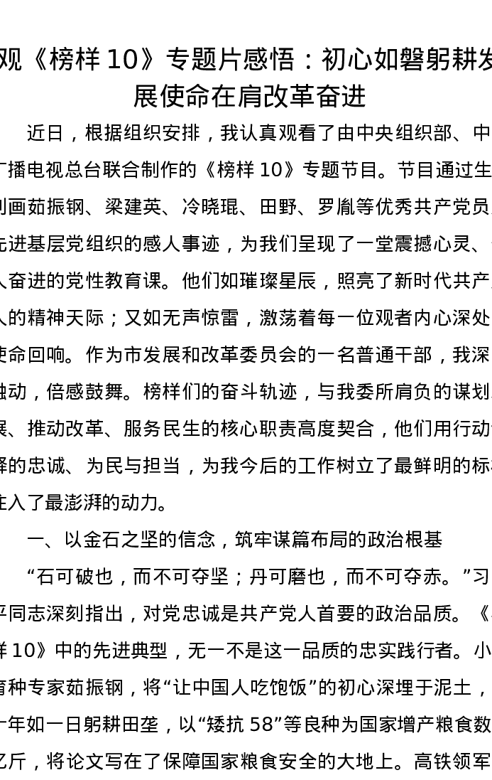 观《榜样10》专题片感悟:初心如磐躬耕发展 使命在肩改革奋进