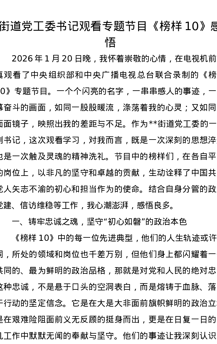 街道党工委书记观看专题节目《榜样10》感悟