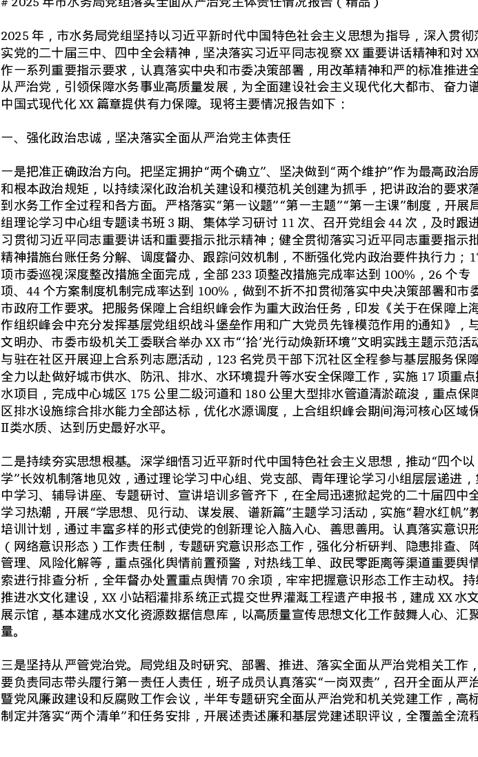 2025年市水务局党组落实全面从严治党主体责任情况报告