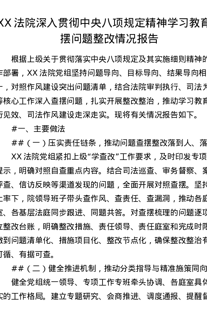XX法院深入贯彻中央八项规定精神学习教育查摆问题整改情况报告(3458字)