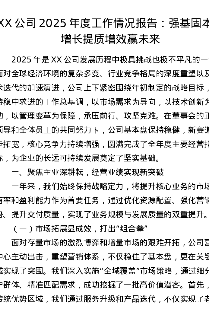 XX公司2025年度工作情况报告:强基固本稳增长 提质增效赢未来