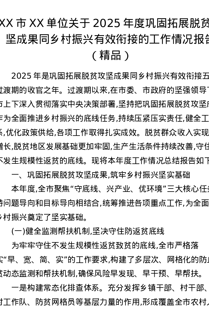 XX市XX单位关于2025年度巩固拓展脱贫攻坚成果同乡村振兴有效衔接的工作情况报告