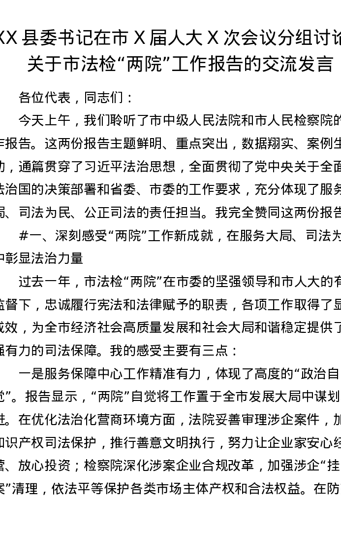 XX县委书记在市X届人大X次会议分组讨论上关于市法检两院工作报告的交流发言(2532字)