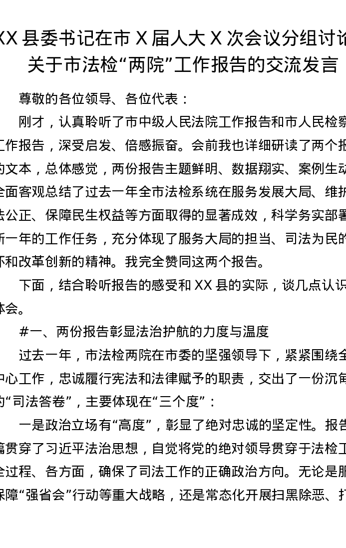 XX县委书记在市X届人大X次会议分组讨论上关于市法检两院工作报告的交流发言(2730字)