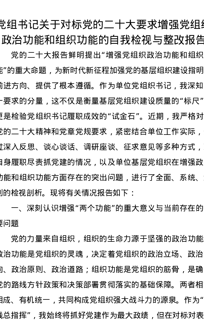 党组书记关于对标党的二十大要求增强党组织政治功能和组织功能的自我检视与整改报告