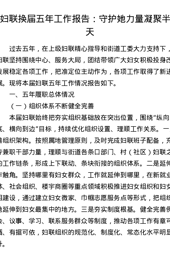 妇联换届五年工作报告:守护她力量 凝聚半边天