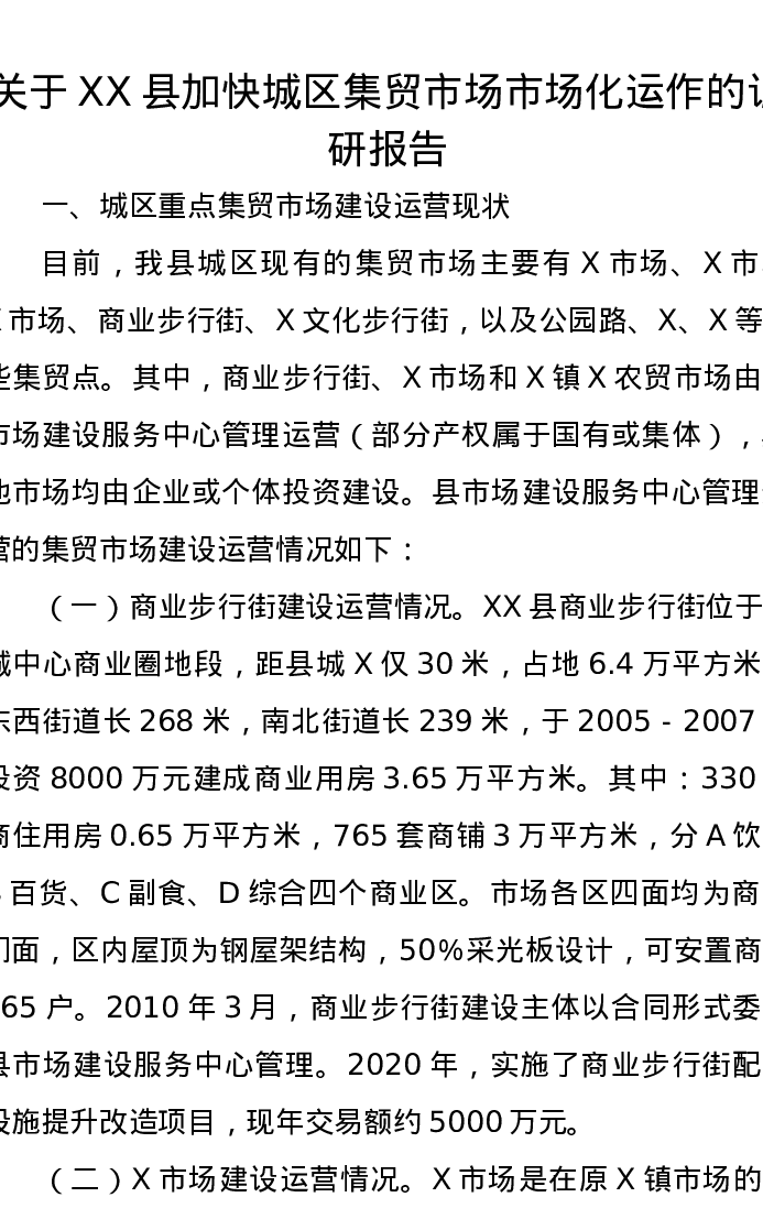 关于XX县加快城区集贸市场市场化运作的调研报告