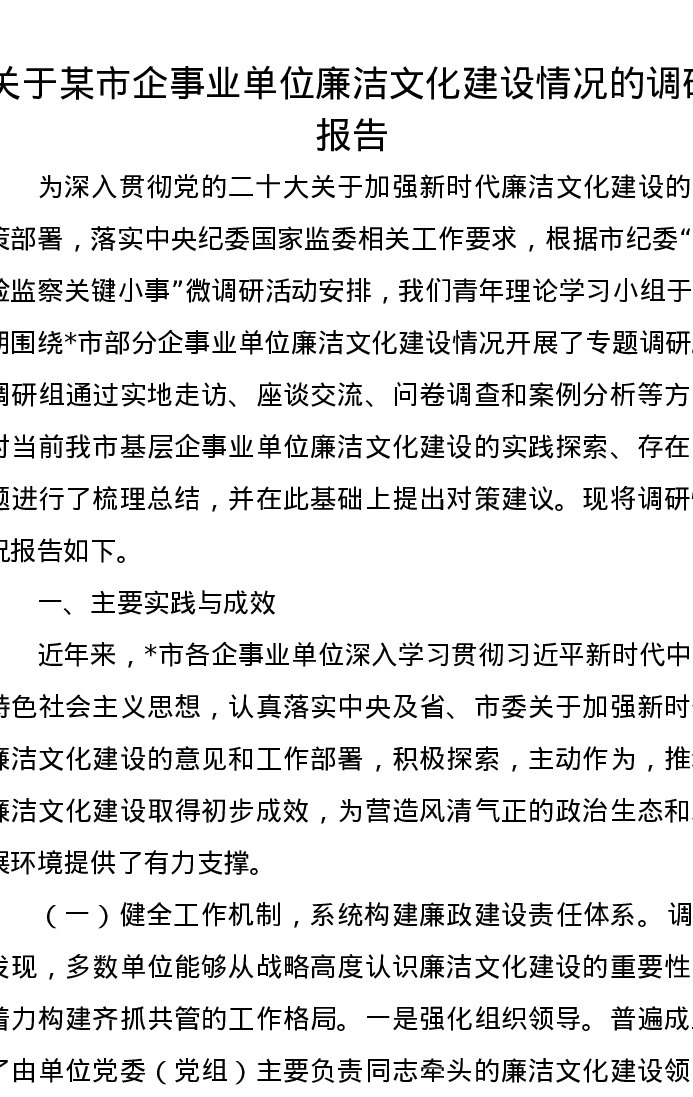 关于某市企事业单位廉洁文化建设情况的调研报告
