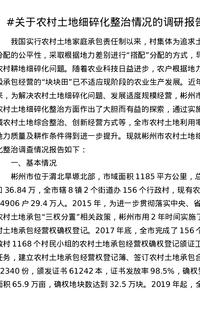 关于农村土地细碎化整治情况的调研报告