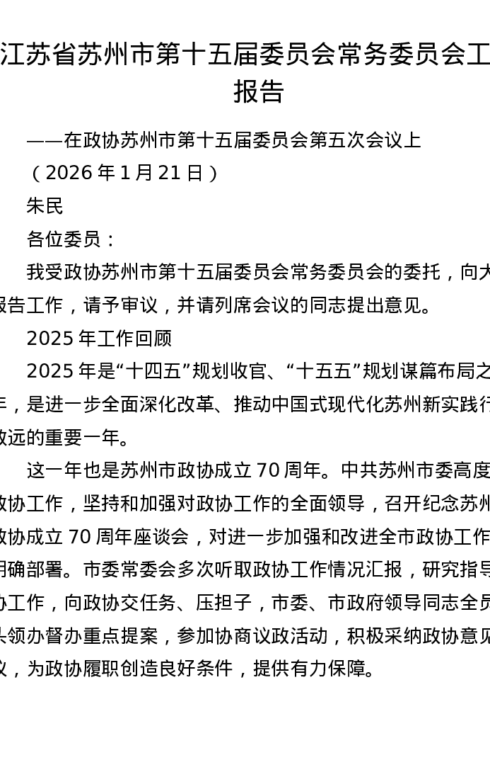 江苏省苏州市第十五届委员会常务委员会工作报告